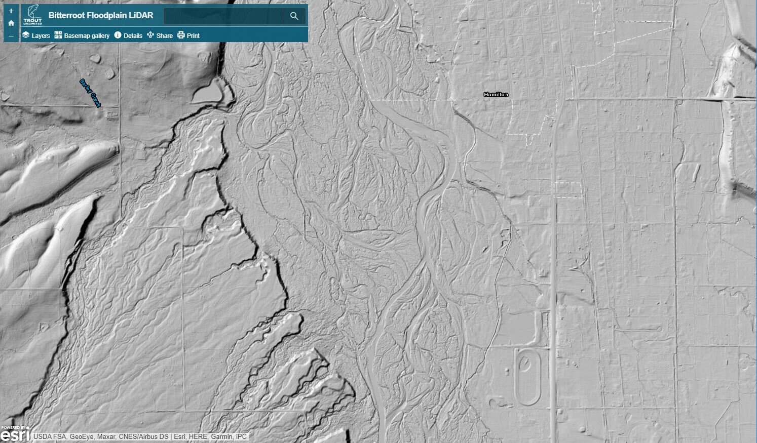 This amazing new interactive map of the Bitterroot floodplain was developed by Christine Brissette, Special Projects Manager for Trout Unlimited, in collaboration with Trout Unlimited and Bitterroot Chapter of Trout Unlimited. This map was created with LiDAR (light detection and ranging) data, a technique that uses an aircraft-mounted laser to survey large landscapes at a very fine scale. The LiDAR survey was completed by the Ravalli County Planning Department between 2008-2013. Trout Unlimited then worked with Montana State Library to convert the survey data into an online, interactive map.